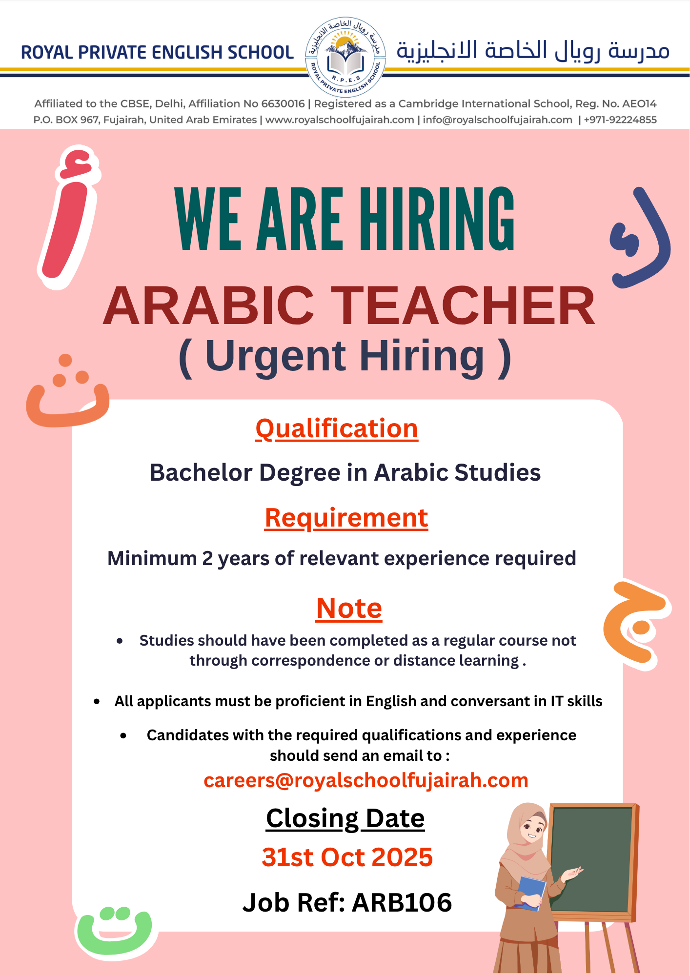 | ARABIC TEACHER - URGENT HIRING | VIEW DETAILS |